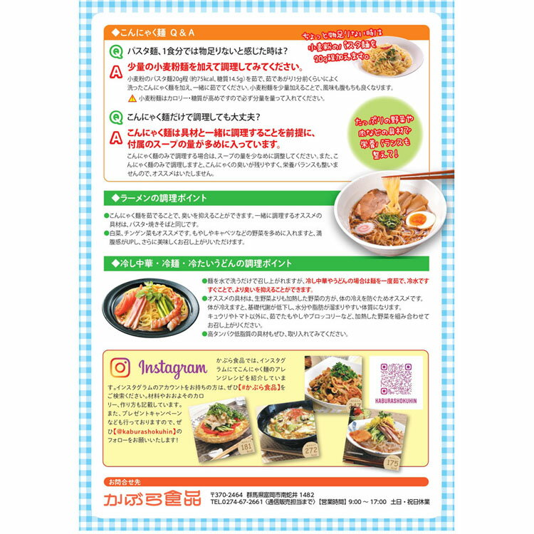 ・ラーメン風こんにゃく 醤油・ラーメン風こんにゃく 味噌・ラーメン風こんにゃく とんこつ・パスタ風こんにゃく ナポリタン・パスタ風こんにゃく ペペロンチーノ・パスタ風こんにゃく カルボナーラ・こんにゃく麺のソース焼そば●商品サイズ(cm)幅約20×奥行約14×高さ約3●内容量(各2個)<ラーメン風こんにゃく>醤油 こんにゃく麺約150g・液体スープ45g味噌 こんにゃく麺約150g・液体スープ約38gとんこつ こんにゃく麺約150g・液体スープ約29g<パスタ風こんにゃく>ナポリタン こんにゃく麺約150g・粉末ソース約10gペペロンチーノ こんにゃく麺約150g・粉末ソース約6gカルボナーラ こんにゃく麺約150g・粉末ソース約10g<こんにゃく麺のソース焼そば>こんにゃく麺約150g・粉末ソース約10g●原材料こんにゃく精粉、水酸化カルシウム等●成分タンパク質、脂質、炭水化物、ナトリウム等○広告文責:e-net shop株式会社(03-6706-4521)○メーカー(製造):かぶら食品○区分:日本製・食品(検索用:こんにゃく麺 こんにゃく ダイエット食 糖質制限 置き換えダイエット 腸活 ヘルシー 食物繊維 低カロリー ダイエット )